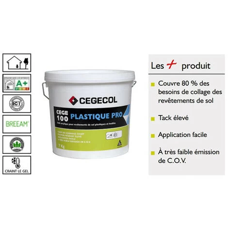 Presentation: CEGECOL Cege 100 Plastic pro acrylic adhesive is ideal for gluing plastic and textile floor coverings. It is specially designed for the application of interior floors in P2 and P3 areas, for the gluing of homogeneous PVC floors, semi-flexible tiles, carpeting, needlepunched and coir-sisal. This adhesive is suitable for most substrates, including underfloor heating! This product is rated A+ very low emissions on the index of volatile substances in the air with a risk of toxicity by inhalation, on a class scale from A+ (very low emissions) to C (high emissions). It also has the GEV-EMICODE label, which guarantees controlled low emissions. Cegecol is a brand of the SIKA Group, specializing in durable waterproofing, bonding and grouting products that respect users and the environment. Advantages: Suitable for heated floors! Covers 80% of the bonding needs of floor coverings High bonding power Easy application, ready to use Very low V.O.C. emission Characteristics : Composition: water-based acrylic resins in dispersion, solvent-free, ready to use single glueing Density: ≈ 1.3 pH: ≈ 7.5 Non-flammable when used Gumming time: 10 to 20 min Open time: 50 to 60 min Consumption : 250 to 400 g/m². Weight : 7kg Color : ivory Ref. 581031 Packaging: One CEGECOL acrylic glue for plastic and textile floors Cege 100 Plastic pro – Ivory – 7kg – 581031Delivered in its original packagingCarefully read the instructions before use.