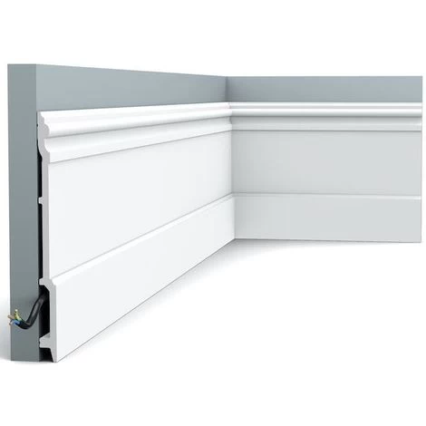 Our skirting boards, sometimes referred to as architrave skirting board, should not be confused with PVC skirting board, DIY plastic skirting board or DIY uPVC skirting. Made from duropolymer, this is a quality Orac product harder than soft wood, but can be repaired in exactly the same way. It is suitable for the professional trades person or home installer. To install your DIY skirting board, general skills are all that are needed. As DIY skirting, once measured, cutting is the same as with wood using a saw, preferably a thicker blade for directional stability and with small sharp teeth. If required, any slight unevenness in surfaces can be filled using our filler. Adhesion is rapid, but there is ample time to make adjustments. With the primed surface, finishing and painting is made easier. To make appear taller still as a panel moulding such as the PX103 a little higher. Install using the correct adhesives.